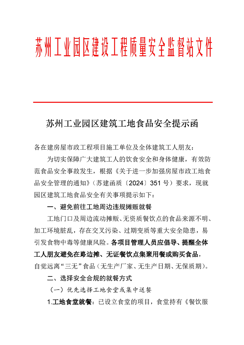 蘇州工業園區建筑工地食品安全提示函