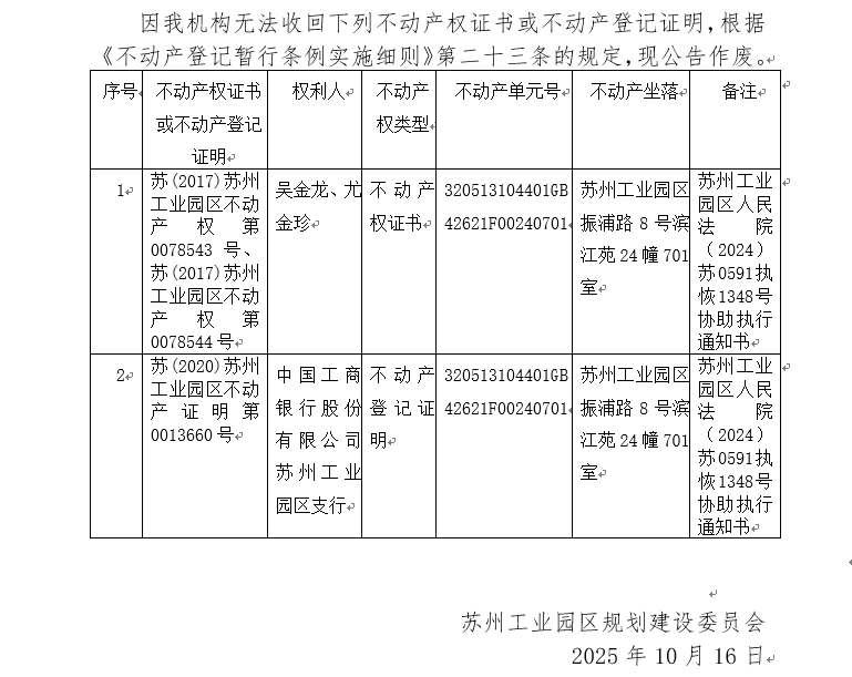 不動產(chǎn)權(quán)證書/登記證明作廢公告蘇園 證廢字2025(0156)號(濱江苑24幢701室)