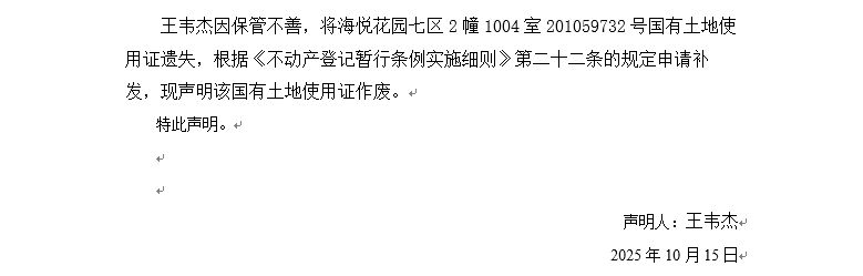 關于海悅花園七區2幢1004室201059732號國有土地使用證遺失聲明