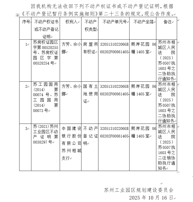 不動產權證書/登記證明作廢公告蘇園 證廢字2025(0159)號(熙岸花園86幢1405室)