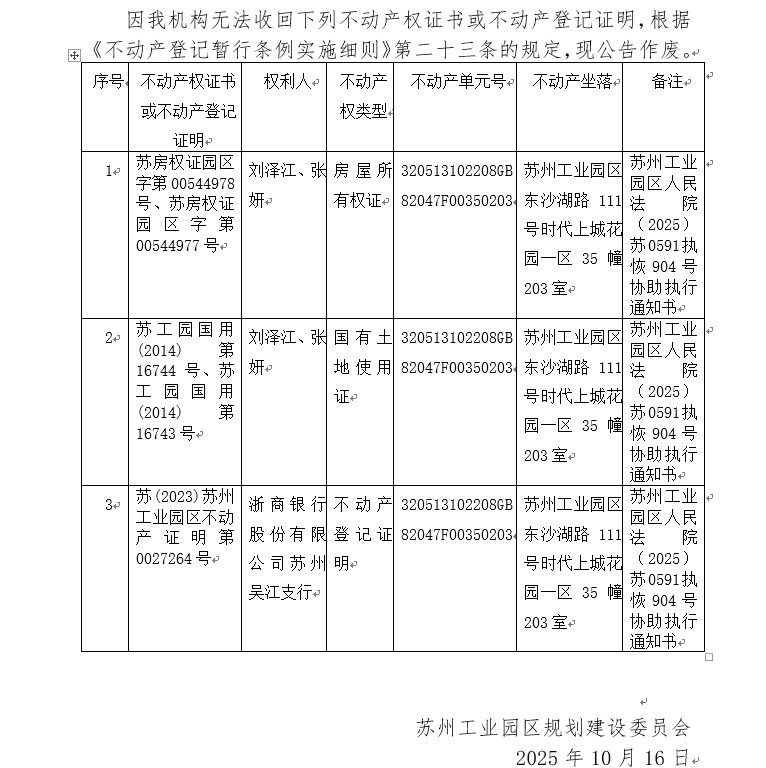 不動產權證書/登記證明作廢公告蘇園 證廢字2025(0153)號(時代上城花園一區35幢203室)