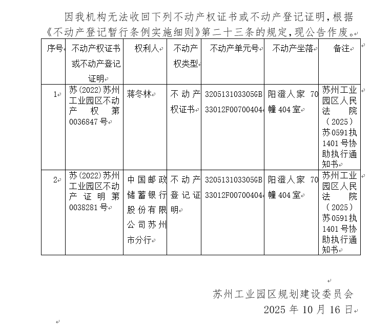 不動產權證書/登記證明作廢公告蘇園 證廢字2025(0147)號(陽澄人家70幢404室)
