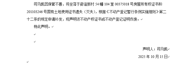 關于葑誼新村54幢104室00375018號房屋所有權證書和201103246號國有土地使用證書遺失聲明