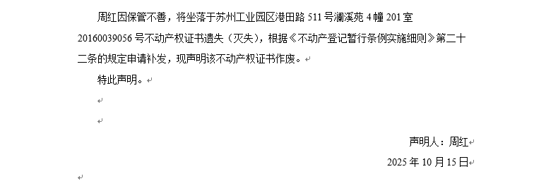 關(guān)于蘇州工業(yè)園區(qū)港田路511號瀾溪苑4幢201室20160039056號不動產(chǎn)權(quán)證書遺失聲明