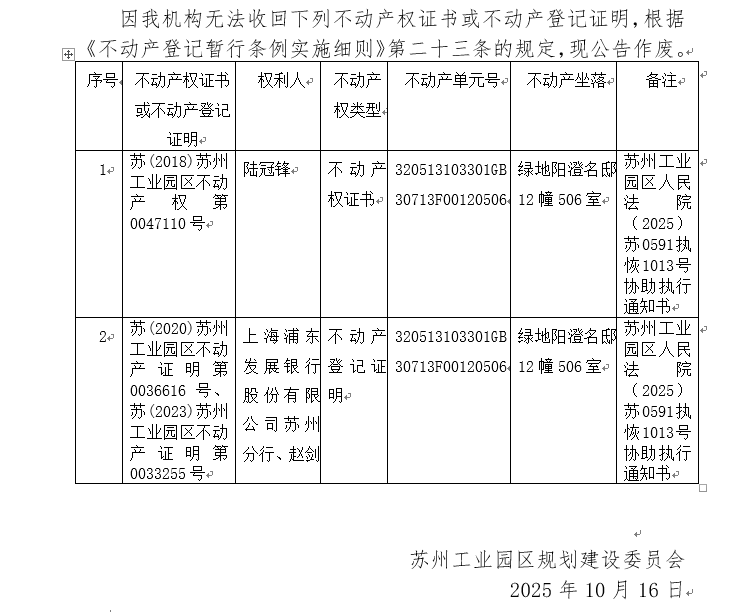 不動(dòng)產(chǎn)權(quán)證書/登記證明作廢公告蘇園 證廢字2025(0154)號(hào)(綠地陽澄名邸12幢506室)