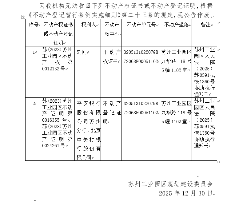 不動產權證書/登記證明作廢公告蘇園 證廢字2025(0202)號(蘇州工業園區九華路118號5幢1102室)