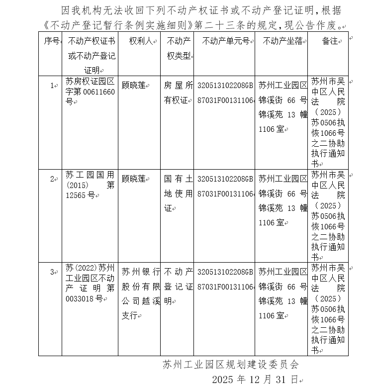 不動產權證書/登記證明作廢公告蘇園 證廢字2025(0206)號(錦溪苑13幢1106室)