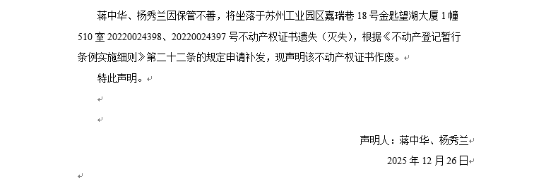 關于蘇州工業園區嘉瑞巷18號金匙望湖大廈1幢510室20220024398、20220024397號不動產權證書遺失聲明
