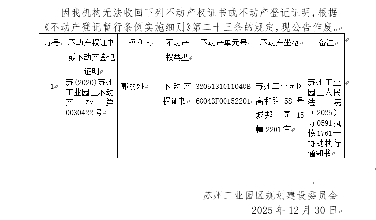 不動產權證書/登記證明作廢公告蘇園 證廢字2025(0201)號(城邦花園15幢2201室)