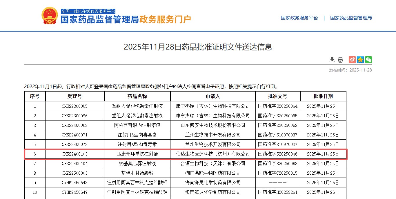 11月28日,信達生物制藥集團(香港聯(lián)交所:01801)宣布,其自主研發(fā)的信美悅?(匹康奇拜單抗注射液)已獲得國家藥品監(jiān)督管理局(NMPA)批準,用于適合系統(tǒng)治療的中重度斑塊狀銀屑病成年患者。