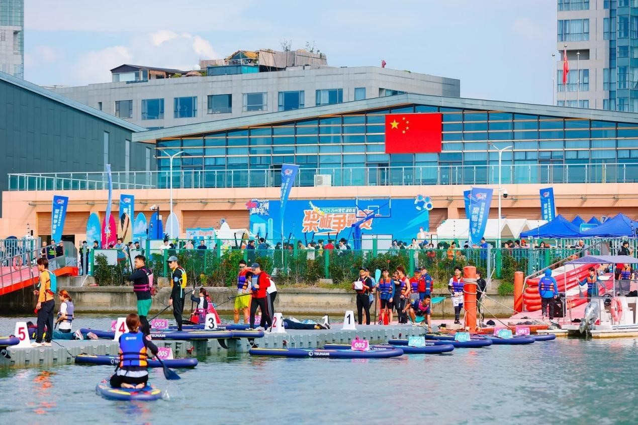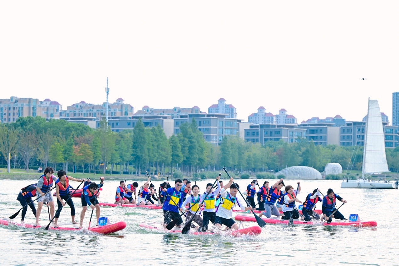 “今天天氣條件很好,湖面平靜,非常適合槳板運(yùn)動(dòng)。”來自西交利物浦大學(xué)代表隊(duì)的隊(duì)員表示,隊(duì)伍平時(shí)會(huì)開展平衡性訓(xùn)練、直線劃行等練習(xí),希望能在這場比賽中發(fā)揮出最好水平。值得一提的是,聚焦科教創(chuàng)新區(qū)特色,來自園區(qū)各科研院所的十余位領(lǐng)軍人才組成代表隊(duì),從實(shí)驗(yàn)室走向水域賽場,展現(xiàn)出科研工作者別樣的活力與風(fēng)采。“雖然剛開始接觸這項(xiàng)運(yùn)動(dòng),但槳板運(yùn)動(dòng)帶來的與自然融合的體驗(yàn)讓人感到非常舒適,期待以賽會(huì)友,在競逐中促進(jìn)交流學(xué)習(xí)。”園區(qū)科研院所領(lǐng)軍人才代表隊(duì)隊(duì)員程功弼說道。