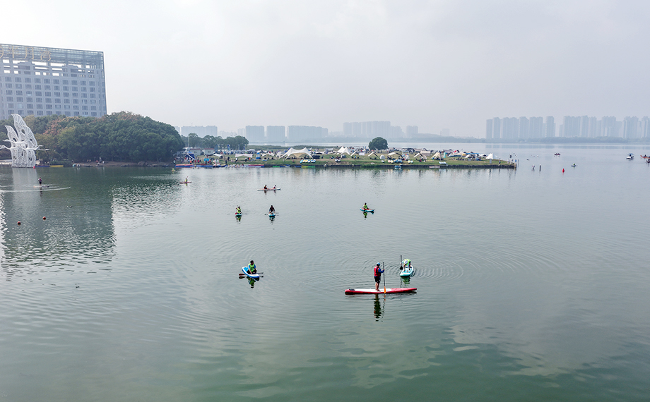 在水上項目體驗區(qū),通過前期線上預約的市民穿戴好裝備,在教練的指導下逐步掌握平衡技巧和御水技術,在前行中感受秋日獨墅湖畔的都市風光與自然之美。
