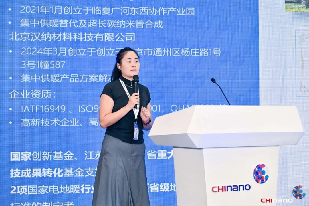 蘇州漢納材料科技有限公司銷售總監(jiān)朱晶晶,分享了《碳納米管及硅碳負極的研發(fā)及應用進展》。該公司依托自主研發(fā)的超長碳納米管合成、無損分散及精密成膜技術,實現(xiàn)電熱轉換率高達99.19%的納米發(fā)熱膜,遠紅外轉換率超85%,顯著提升能效與舒適度。同時,漢納材料在硅碳負極方向開發(fā)出10nm級納米硅合成技術,為動力電池提供高性能負極方案;并在單壁碳納米管的量產方向取得顯著突破。企業(yè)憑借60余項專利及多地產學研合作,持續(xù)拓展碳材料在新能源、健康建筑等領域的應用邊界。