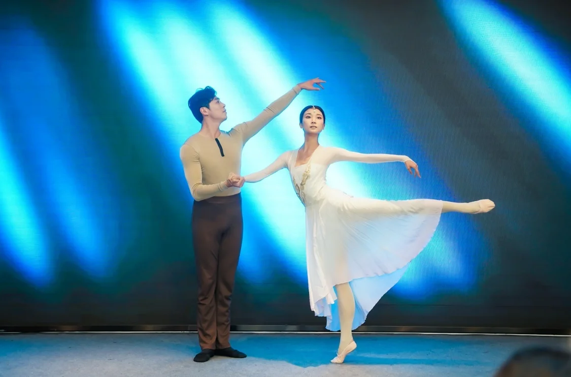 現(xiàn)場(chǎng),蘇州芭蕾舞團(tuán)以柔美與力量交融的《鵲橋》片段拉開帷幕,藍(lán)調(diào)追光下,舞者裙擺劃出透亮弧線,仿佛將江南水韻融入足尖芭蕾的韻律之中。