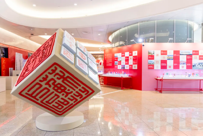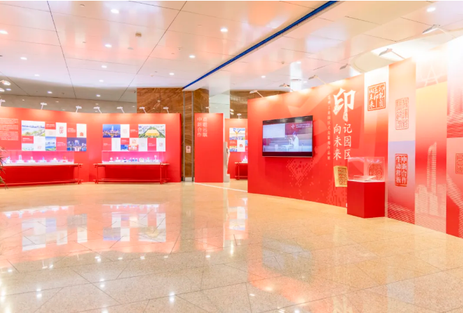 直播鏡頭跟隨導(dǎo)覽人的腳步,深入解讀了展覽的兩大構(gòu)成部分。第一部分“印記園區(qū)”以94枚全新創(chuàng)作的印章,構(gòu)建出“領(lǐng)航壁畫”“志合山海”“吳風(fēng)湖韻”“勇立潮頭”“盛世江南”五大篇章。這些作品不僅凝結(jié)了園區(qū)篆刻愛好者與專業(yè)工作者的創(chuàng)意巧思,更特別聚焦于園區(qū)的經(jīng)濟(jì)發(fā)展、科技創(chuàng)新、自然景觀與產(chǎn)城融合圖景進(jìn)行創(chuàng)作,讓古老的篆刻藝術(shù)與園區(qū)的現(xiàn)代化發(fā)展深度交融。