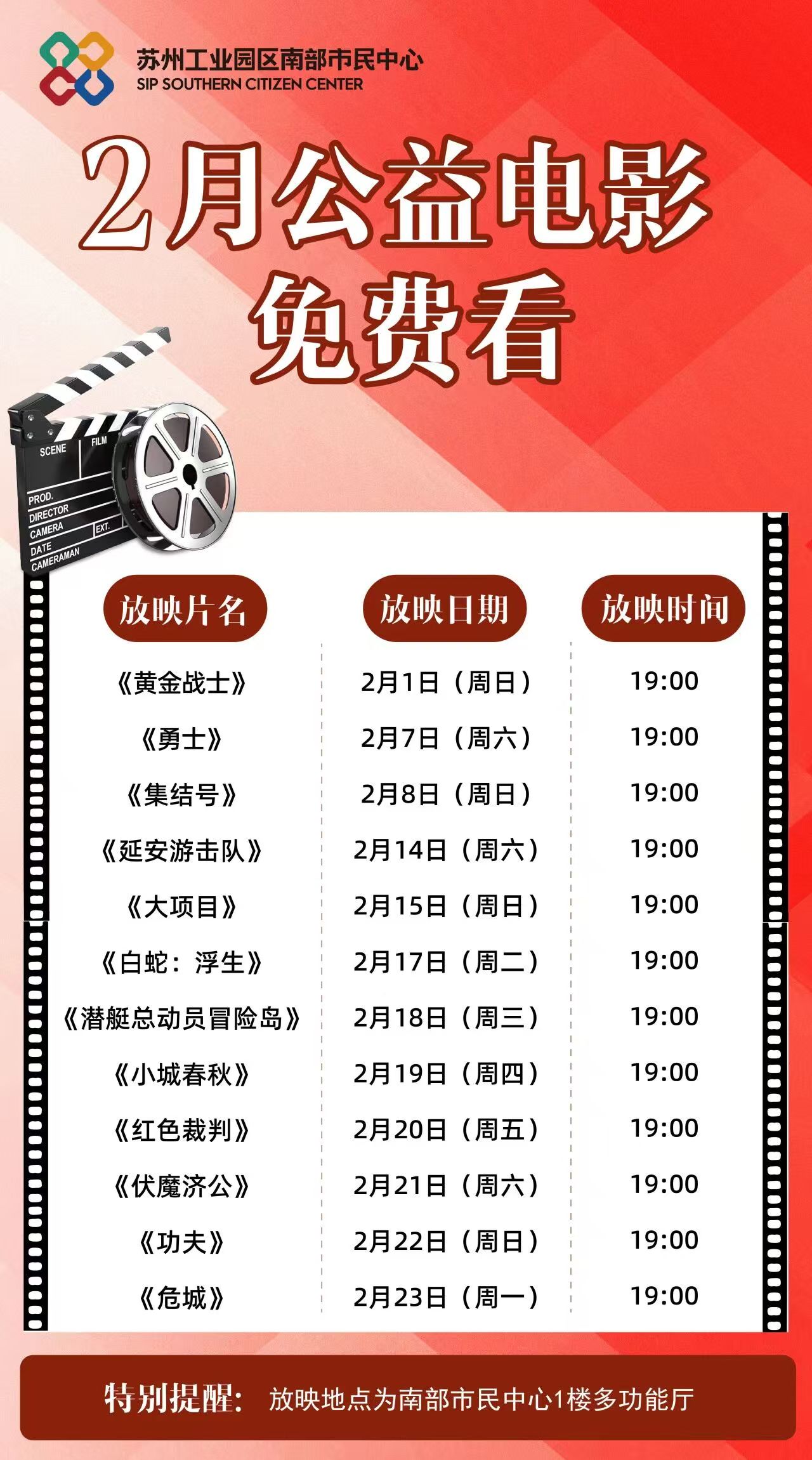 春節(jié)期間,文化惠民不打烊。園區(qū)南部、北部市民中心將推出公益電影展映,二十余場(chǎng)經(jīng)典影片免費(fèi)播放,包括《白蛇:浮生》《小城春秋》《功夫》等等,讓市民在團(tuán)圓之余,享受一份輕松愉悅的光影之樂。