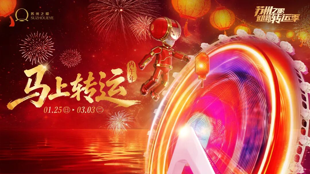 蘇州之眼摩天輪“馬上轉(zhuǎn)運”活動,以128米高空登高望遠、轉(zhuǎn)運納福為特色,融合云端特色餐飲、生肖禮遇、新春特惠、新春限定打卡贏好禮,以及剪紙、魚燈巡游、國潮電音、機器狗拜年等傳統(tǒng)+科技的新春互動,打造“晝夜皆景、日夜暢玩”的沉浸式年節(jié)。