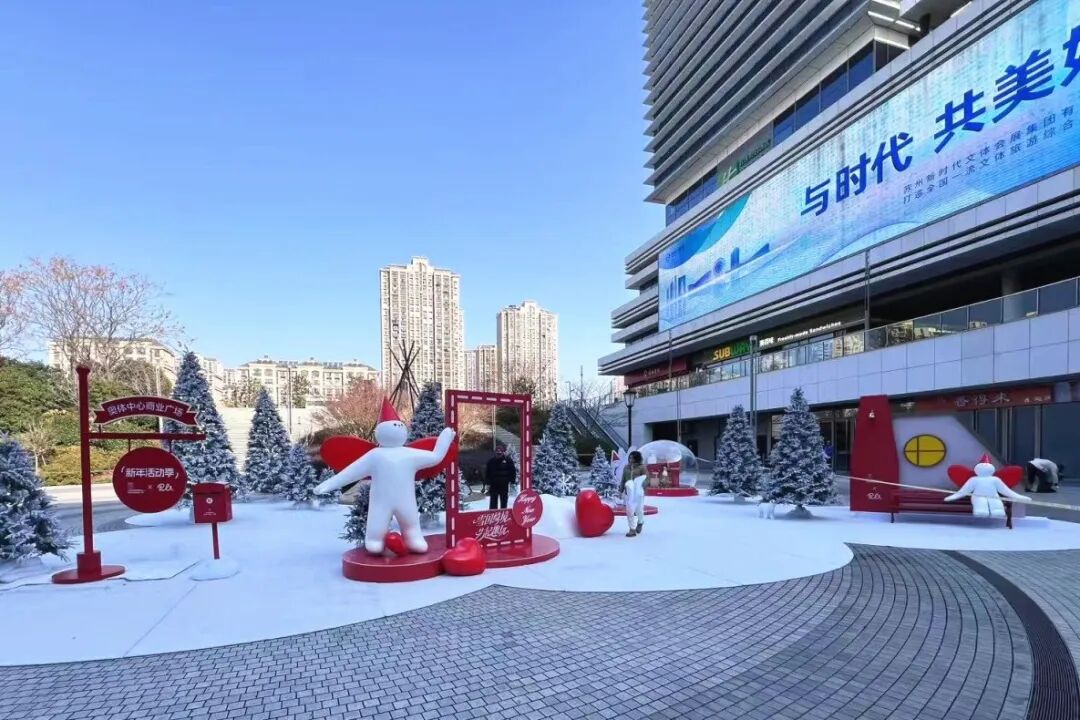 在蘇州奧體中心商業(yè)廣場,頭戴紅色尖角帽的軟萌撲拉PULA帶著對雪國的全部想象,將這里裝點成夢幻之地。鋪著仿真雪的空間里,霧凇燈串營造出冬日的松弛感,巨型水晶球裝置裝滿禮物和小雪人,雪屋休憩區(qū)和專屬打卡框則為市民游客與PULA合影留出足夠空間。