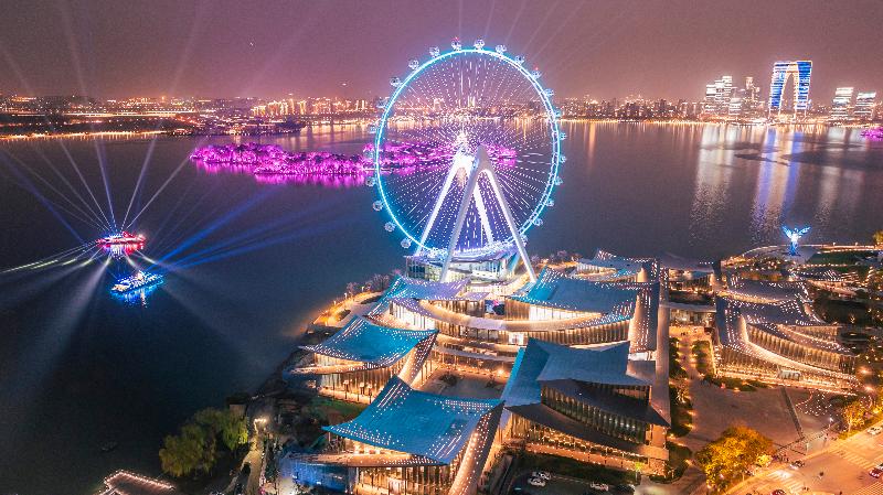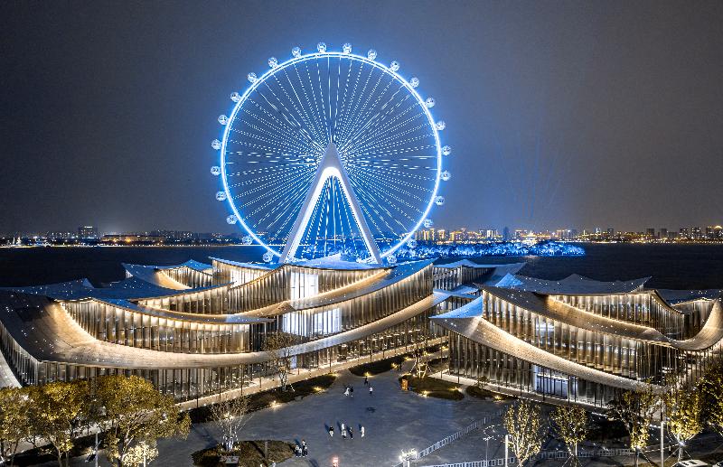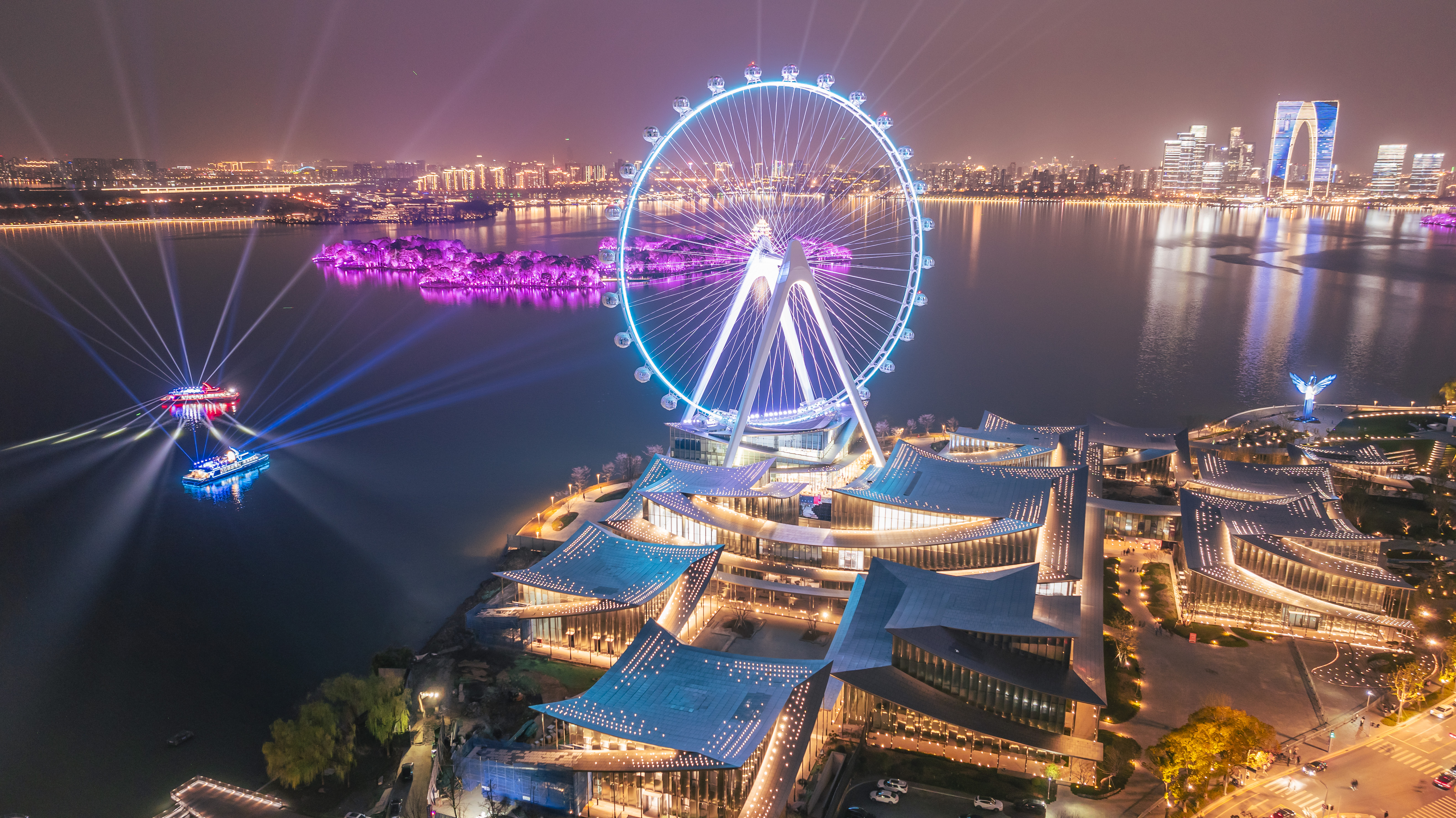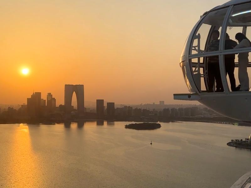“蘇州之眼”摩天輪高128米,是亞洲最大的水上摩天輪,同時(shí)也是全球第八座回轉(zhuǎn)式太空艙摩天輪。它共設(shè)有28個(gè)全景轎廂,每個(gè)轎廂可容納25人,旋轉(zhuǎn)一圈約30分鐘,可360°俯瞰金雞湖及園區(qū)乃至蘇州全景,和傳統(tǒng)摩天輪相比,乘坐體驗(yàn)更加安全、愜意。