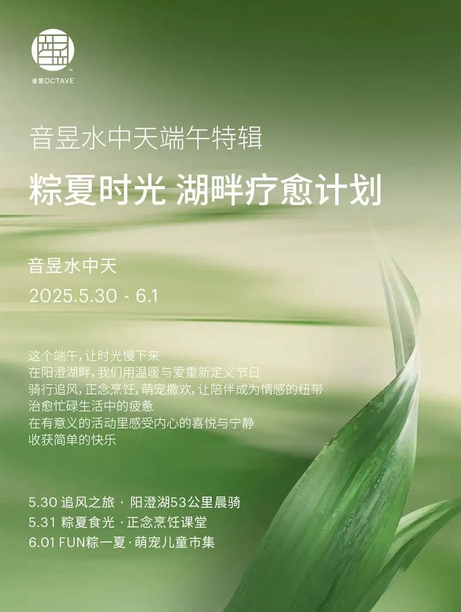 音昱水中天推出端午特輯“粽夏時光 湖畔療愈計劃”,邀你在陽澄湖畔騎行追風、正念烹飪、萌寵撒歡,讓時光慢下來,讓陪伴成為情感的紐帶,在有意義的活動里感受內心的喜悅與寧靜,收獲簡單的快樂。