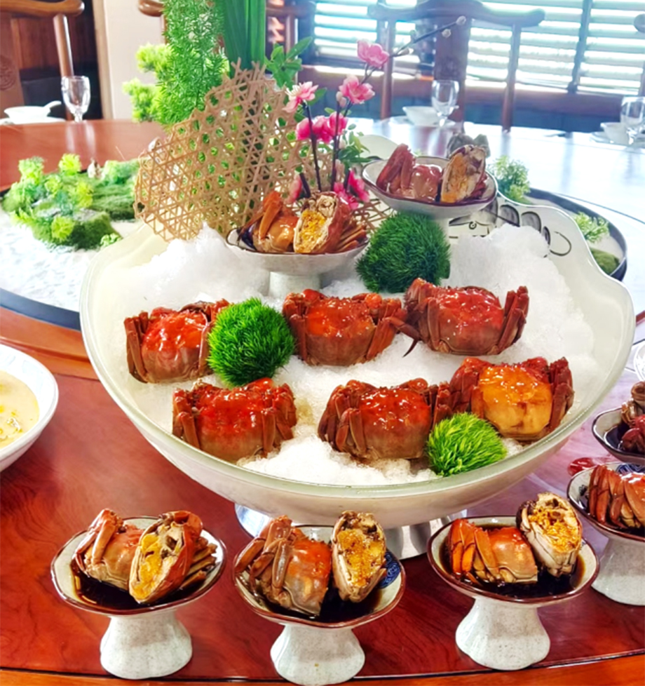 若要票選江南人最貪戀的味道,冰鎮(zhèn)花雕熟醉蟹絕對(duì)是的“頂流”。這道菜要選用最肥美的陽澄湖大閘蟹,在蒸到殼紅肉嫩時(shí),浸入用六年陳花雕和秘制香料調(diào)得透亮的醉鹵——酒香像溫柔的手,慢慢揉開蟹肉的鮮;蟹黃吸飽了酒意,咬開是流油的綿密;蟹肉更絕,緊致里帶著清甜,每一口都是“鮮得眉毛掉”的江南本味。這道菜看著簡單,卻是廚師把陽澄湖的晚霞和秋風(fēng),釀進(jìn)了所有江南饕客的心底。