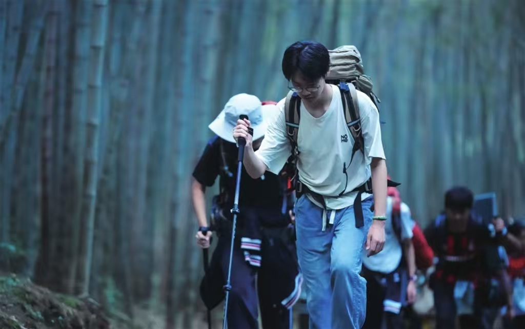 此次探險中,騎行隊伍以“百來公里”為目標,在平路與風雨中交替前行,汗水反復浸濕衣衫,每一公里都是對意志力的淬煉;徒步人員則背負行囊深入崎嶇山路,近40公里的路程里,沉重背包與濕滑陡坡考驗著平衡與體能,高溫與風雨更讓這段旅程充滿挑戰(zhàn)。從晨曦到日暮,學子們全程自主規(guī)劃路線、協(xié)作扎營做飯,在團隊互動中完成體力與意志的雙重考驗。