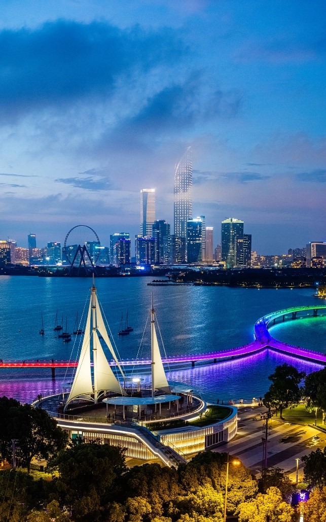 目光轉(zhuǎn)向金雞驛06,獨特的帆船造型設(shè)計成為沿湖的視覺焦點。這里不僅是蘇州市帆船聯(lián)賽等專業(yè)賽事的舉辦地,更面向市民開放帆船體驗項目,在暢游湖面之余盡覽東方之門與桃花島美景。驛站二層特別打造的全景露臺是觀賞落日的絕佳位置,隨手一拍便是夏日限定。夜幕降臨時,點杯雞尾酒靜賞湖光,或沿著彩虹橋漫步,看星光步道一點點亮起,感受別具一格的濱湖夜生活魅力。