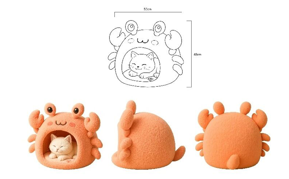 作品以“陽澄湖大閘蟹”為靈感,結(jié)合寵物友好主題進(jìn)行設(shè)計。延伸出一系列包含螃蟹貓窩、水杯、頭盔、寵物碗的設(shè)計,整體造型Q萌。不僅滿足寵物的休憩需求,同時也呼應(yīng)了環(huán)保與循環(huán)利用理念。