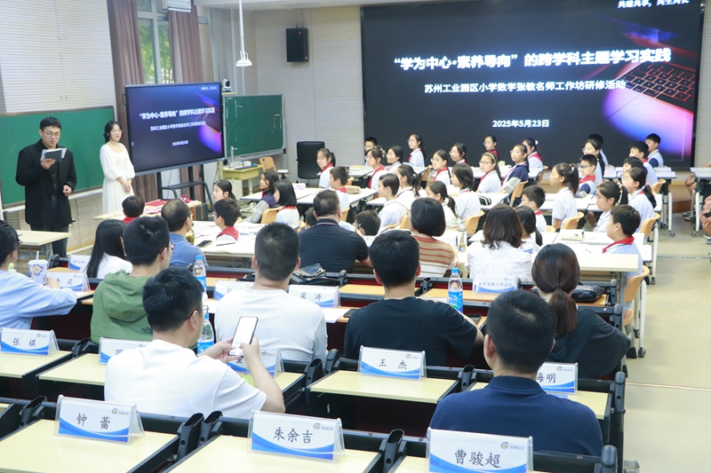 2025年5月23日下午,蘇州工業(yè)園區(qū)小學(xué)數(shù)學(xué)張敏名師工作坊第3次研修活動暨“蘇·寧·揚”三校小學(xué)數(shù)學(xué)區(qū)域教學(xué)聯(lián)盟研修活動在青劍湖小學(xué)開展,活動以“學(xué)為中心·素養(yǎng)導(dǎo)向”的跨學(xué)科主題學(xué)習(xí)實踐為主題,張敏名師工作坊全體成員、南京市金陵小學(xué)數(shù)學(xué)團隊、揚州市文峰小學(xué)數(shù)學(xué)團隊、青劍湖教育集團各校骨干教師,青劍湖小學(xué)全體教師參加了活動。