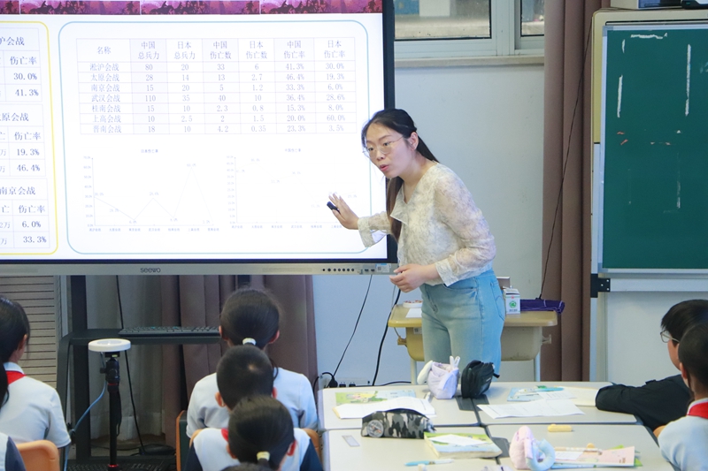 南京市金陵小學(xué)張祎寧老師執(zhí)教的《數(shù)說“抗日戰(zhàn)爭”》將數(shù)學(xué)與歷史學(xué)科相融合,通過對抗日戰(zhàn)爭中物資產(chǎn)量、兵力部署、傷亡比例等關(guān)鍵數(shù)據(jù)的深入分析,將歷史事件量化為可計算、可比較的數(shù)學(xué)問題,讓學(xué)生在數(shù)學(xué)學(xué)習(xí)中銘記歷史、珍愛和平,使數(shù)學(xué)課堂成為歷史教育的生動載體。