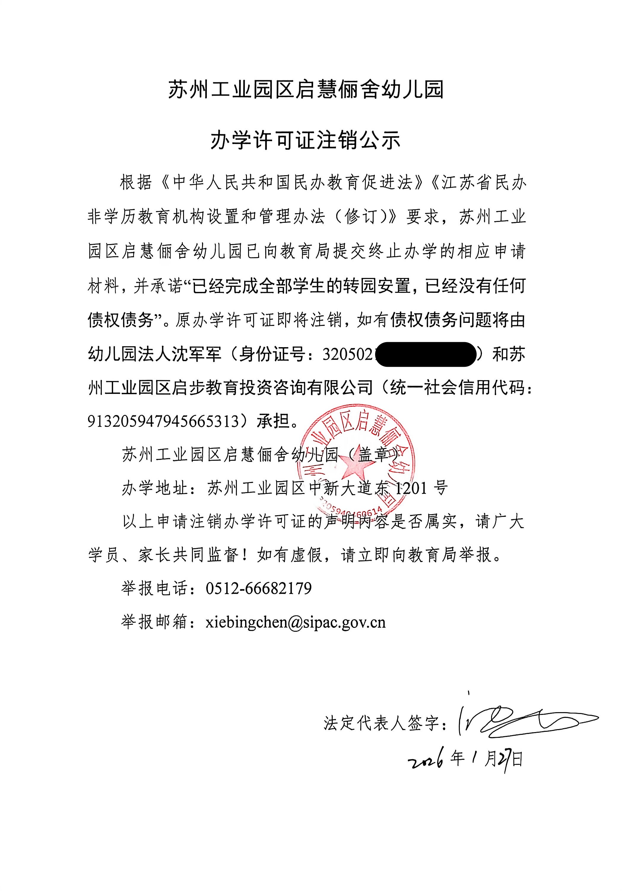 蘇州工業(yè)園區(qū)啟慧儷舍幼兒園辦學(xué)許可證注銷公示